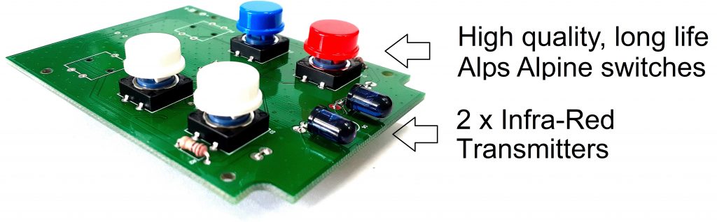 Multiple Infra-Red transmitters maximise the range of the transmitted commands from the hand unit.